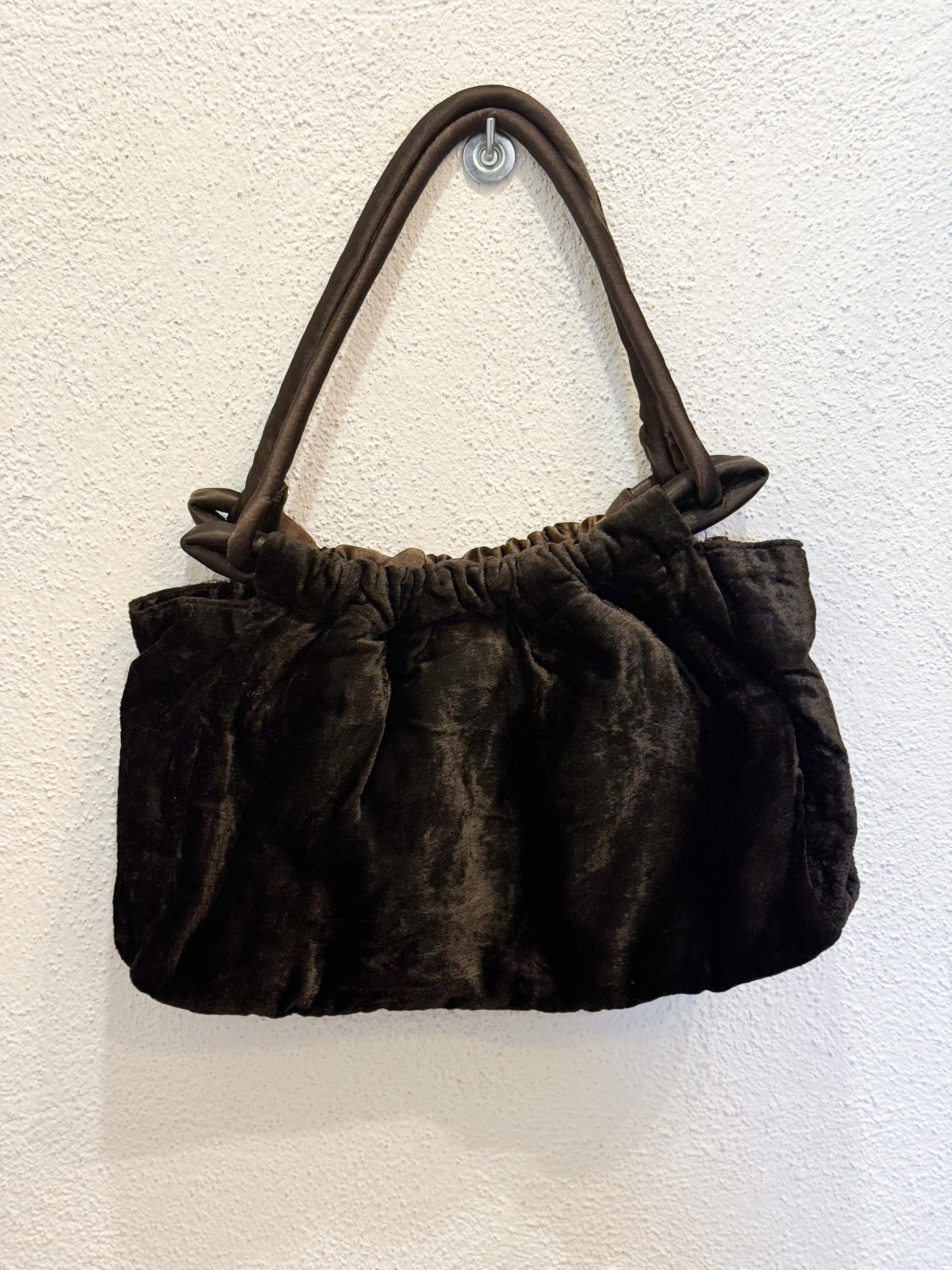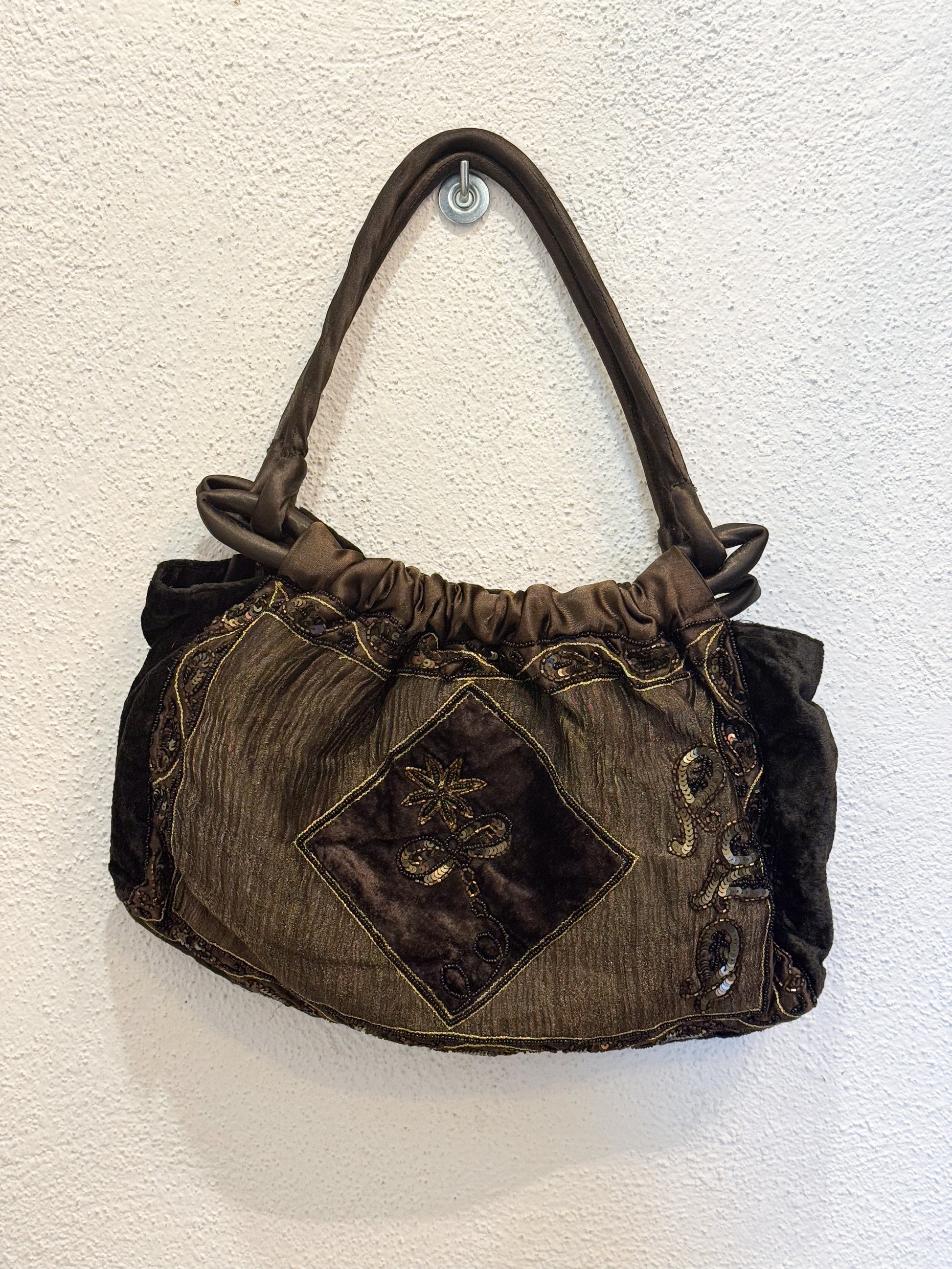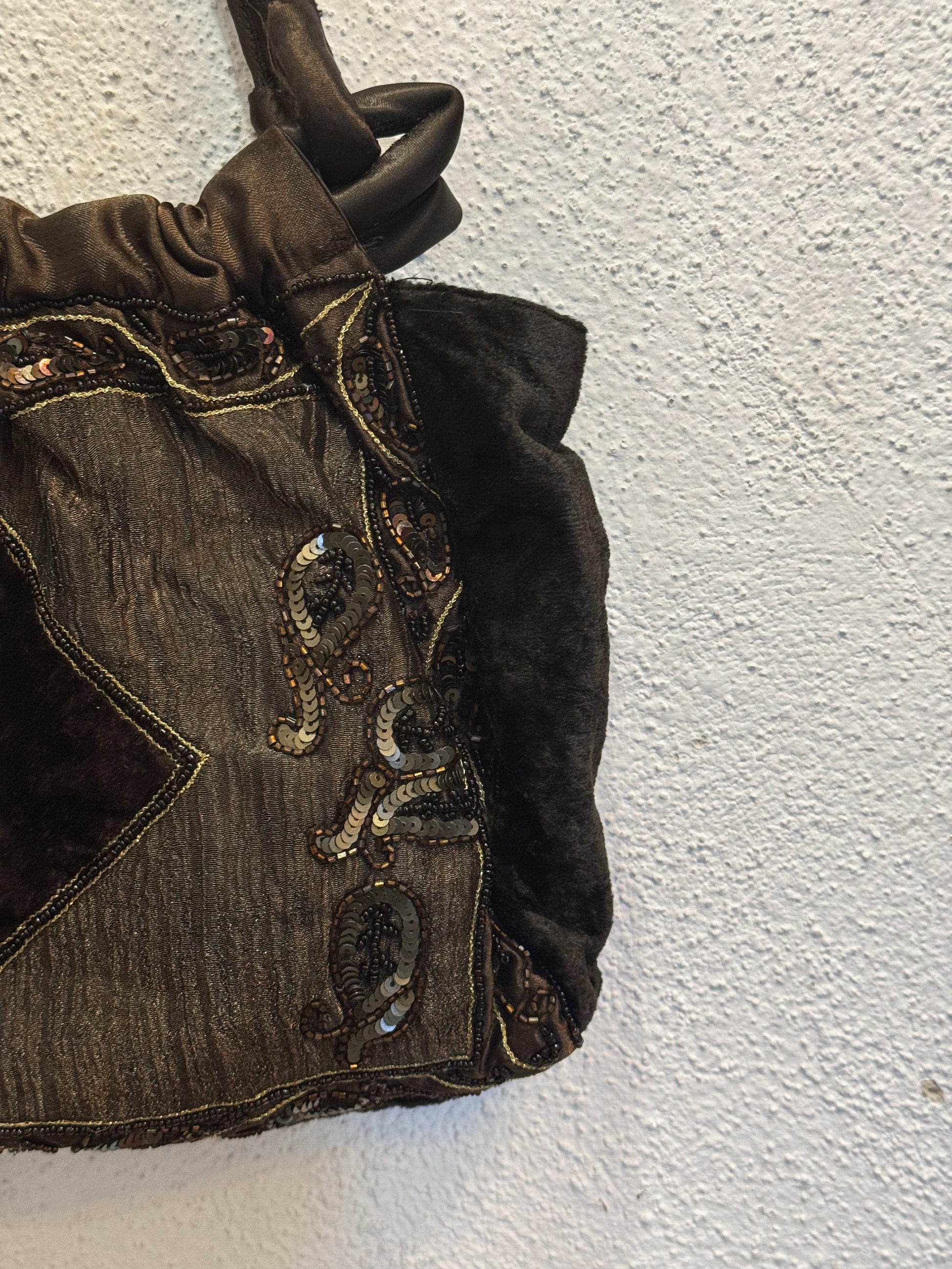 Borsetta boho vintage. A spalla. Marrone in velluto, con perline e paillettes.