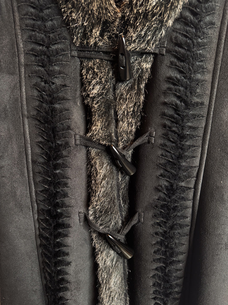 Cappotto modello afgano. Pelliccia su collo e polsi. Abbottonatura centrale con alamari. Cintura in vita. Molto lungo. Taglia M.